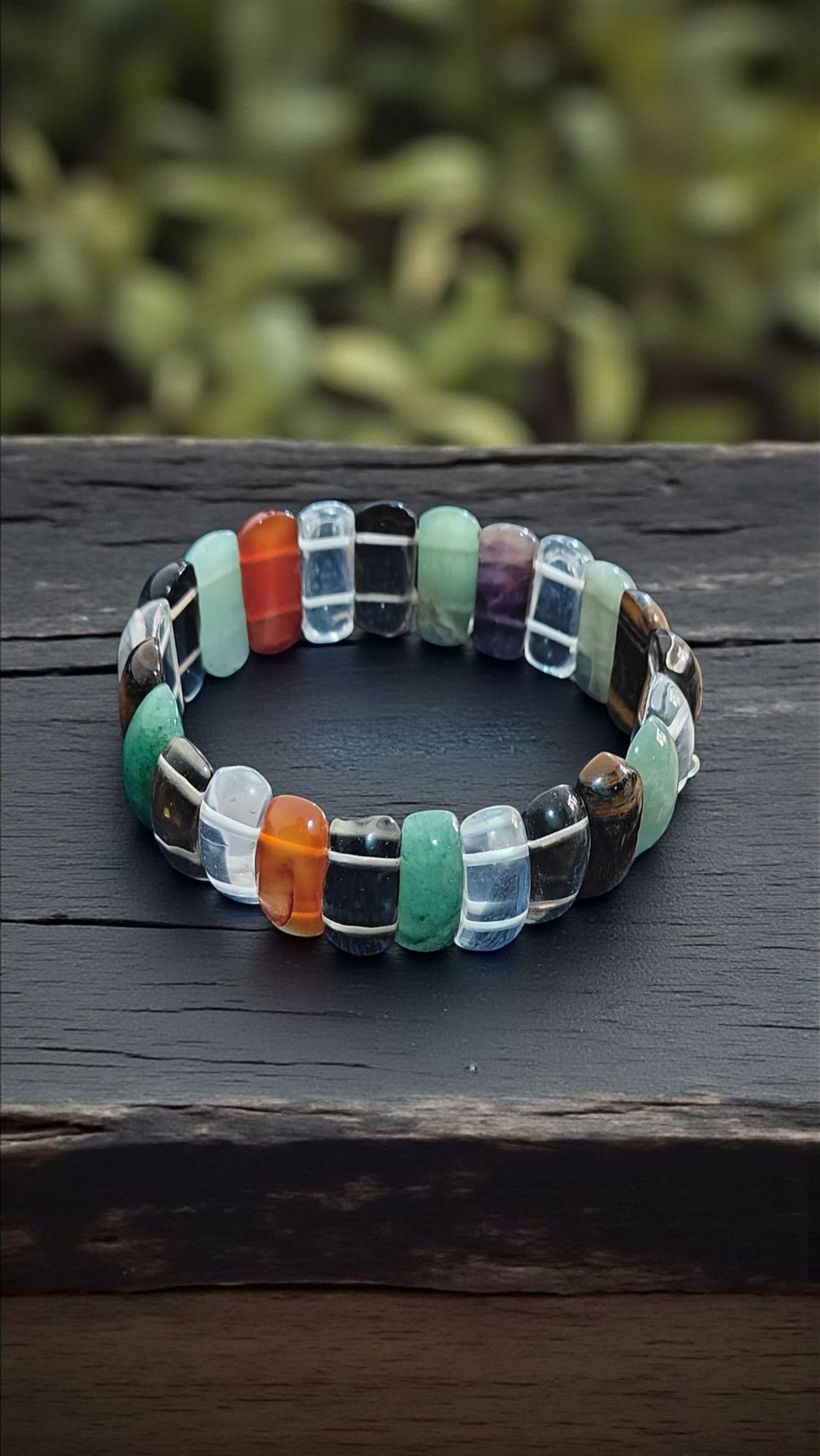 This beautiful bracelet has been made from Natural stones like Tiger eye, Crystal , Green Jade, Amethyst , Carnelian , Smokey quartz. The stones have been carved beautifuly to give attractive design and shape.