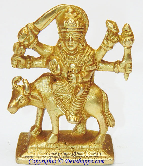 Umiya Mata ji is shown sitting on cow. She holds weapons like sword, Trishul and chakra in her hands.