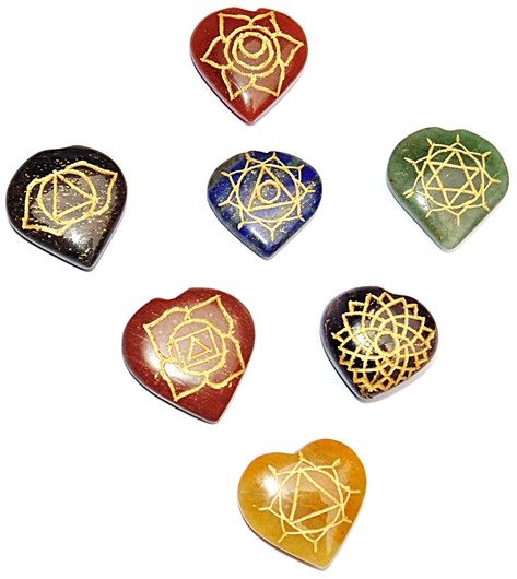 Heart shaped Chakra set 7 stones etched engraved Crystal Healing Reiki Wicca Etc