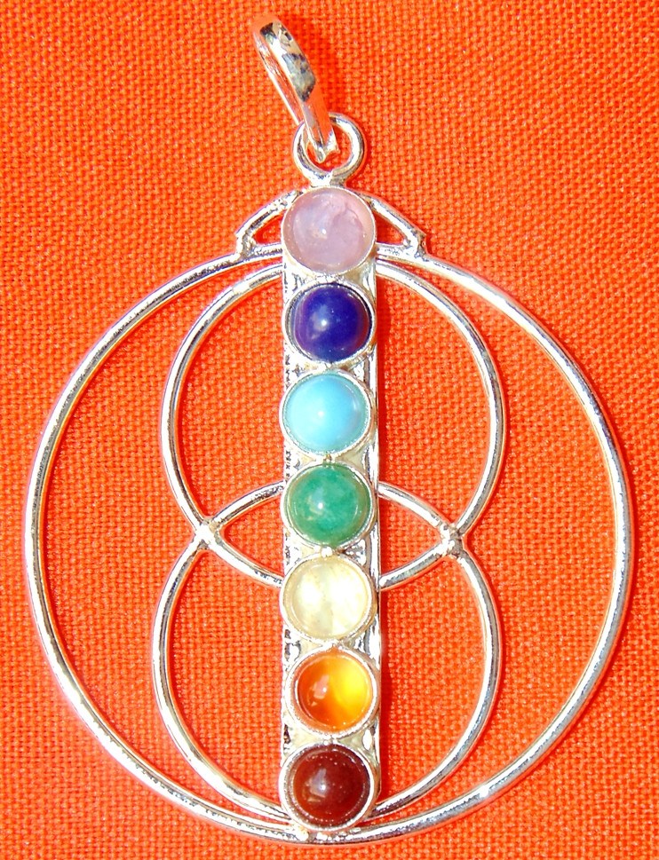 This is beautiful Triple circles shaped pendant made in German Silver. For this pendant a different crystal is used to represent each of the chakras. Each is chosen because of their colour and also by the qualities that the crystal possesses.