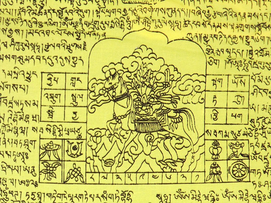 The 4 Dignities surround WindHorse in the 4 corners of the flag. They are: Garuda, Dragon, Snow Lion and Snow Leopard. The mantras on the flag are those of Tara, Guru Rinpoche, Vajrasattva and Manjushri.