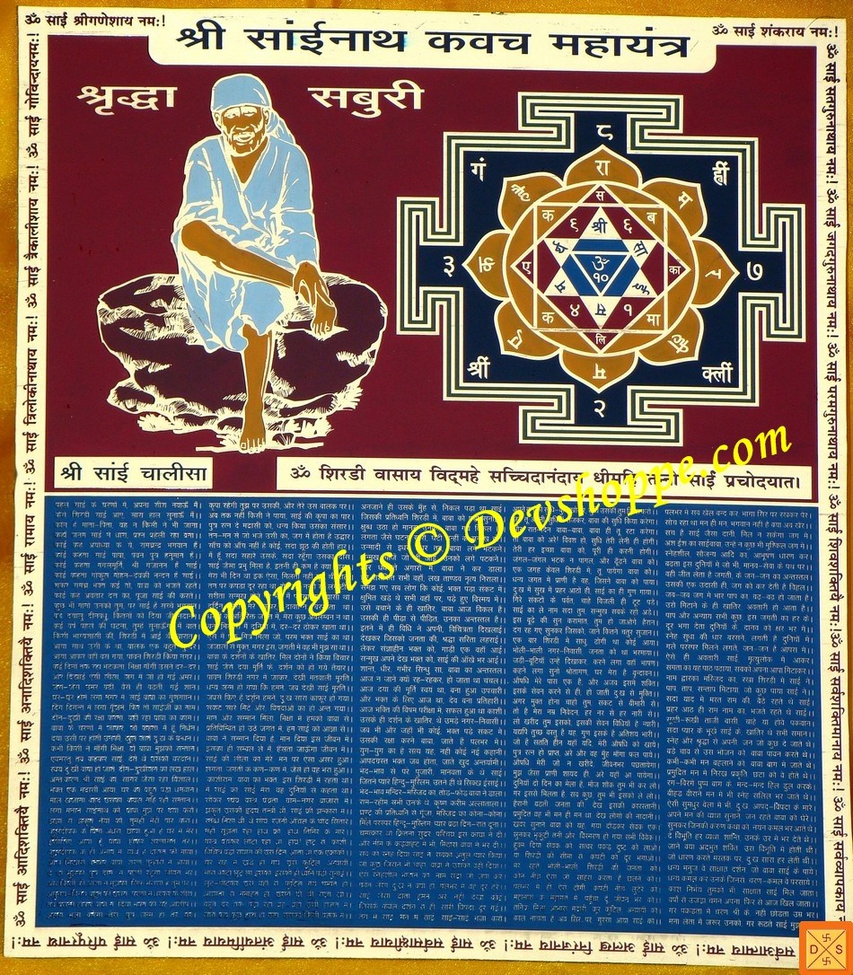 A "Kavach" is a shield or protection against danger. Sri Sai nath kavach maha yantra is a very powerful divine protection tool. Sai Baba of Shirdi, also known as Shirdi Sai Baba, was an Indian Guru, Yogi & Fakir who is regarded by both Hindu & Muslim followers as a saint. Some of his Hindu devotees believe that he was an incarnation of Shiva or Dattatreya.Sai Baba was a divine incarnation whose love for his disciples is very well known . Lacs of people have been blessed by merely having faith and belief in Sai Baba. Sri Sai nath Kavach maha yantra gives the worshipper all the wishes he/she asks for. The blessings of Shri Sai Baba stays with the worshipper. When Sri Sai nath kavach maha yantra is established in home temple, the blessings of Sai Baba are showered on the residents of that house giving them health, wealth and all round prosperity.Sri Sai Kavach Maha yantra is very powerful yantra and provides the worshipper with divine protection. Sri Sai Kavach Maha yantra also helps in removing obstacles from worshipper's life. On top portion of this yantra an image of Sri Sai baba is shown along with Sri Sai nath kavach maha yantra and on bottom portion very powerful Sri Sai Chalisa is written. Devotees reading this Chalisa 108 times will overcome all obstacles. Sri Sai Chalisa is considered as very powerful talisman too .