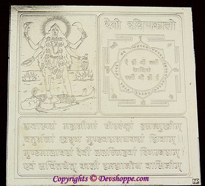 Sri Dakshina Kalika Maha Yantra bestows on the sadhaka the fulfilment of desires, wealth and the comforts.