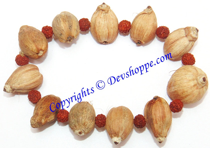 We have used Rudraksha beads as spacers between Laghu nariyals. Rudraksha beads is well known for its healing properties. Rudraksha is said to be rich with shakti and calms the kundalini, thus making it easier to rise. Rudraksha is said to open the heart chakra. They are good for meditation and protection. Legend says that Siva awoke after a thousand years of meditation and began to shed tears of worldly compassion. These tears crystallized into seeds and there grew the first Rudraksha tree.