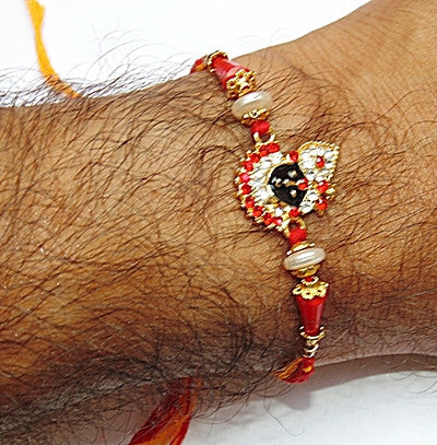 This is beautiful Shri Krishna Raksha sutra wristband . This can also be used as Rakhi. Lord krishna is one of the most widely worshipped and most popular of all Hindu deities. Krishna in Hinduism and Indian mythology, the eighth avatar, or incarnation, of the god Vishnu. Born in Mathura to Princess Devaki and Vasudeva, Krishna was actually brought up by Yashoda and Nanda in Vrindavan. Since childhood the young Lord astonished everyone with his divine acts, some of the famous acts being lifting of the Govardhan Parvat (Mountain) and overpowering the Kaliya Nag in the Yamuna River. Lord Krishna took immense pleasure in performing Rasa-lila (the dance of love) with the Gopis. With his Radharani and other Gopis the Lord danced to glory in the autumn and Monsoon months amid the melodious flute played by him. Bhagwad Gita is Krishna's greatest knowledge and message given to Arjuna at the battlefield of Mahabharata; it is the supreme knowledge passed on to the mankind to live life righteously.