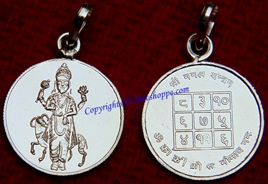 Mangal Yantra is used to remove the malefic effects of Mars and appease Planet Mars spiritually.Mars Yantra can be used to enhance physical and mental strength, brother-sister relations, courage, power etc.The ladies or gents who are deprived off the marriage even upto 30 to 40 years due to certain obstacles or married life is full of miseries and difficulties, bickings, threatened seperation or divorce, should keep Mangal yantra/Mars Yantra toward off above evils.Also Mangal yantra/Mars Yantra works remarkably in case of abortions, denial of children, one remains in debt and is not capable to repay inspite of honest intentions rather debt increases making the life hell, all these difficulties can be spiritually overcomed by wearing/keeping Mangal yantra.