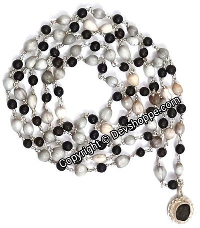 White Vaijanti beads and Black Vaijanti beads combination mala in silver with Shaligram pendant