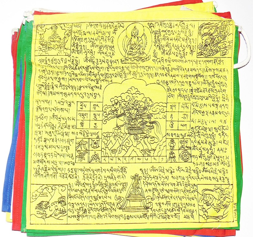 The 4 Dignities surround WindHorse in the 4 corners of the flag. They are: Garuda, Dragon, Snow Lion and Snow Leopard. The mantras on the flag are those of Tara, Guru Rinpoche, Vajrasattva and Manjushri.